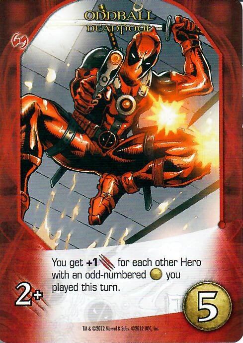 Deadpool is the only hero from the Core Set with no team affiliation. His cards, like his character, are unpredictable and wacky. Here, Hold This For a Second gives a villain a bystander, and gives you two recruit. Oddball is a two-attack card that gains +1 attack value for every odd-numbered hero you’ve played during your turn; since all of Deadpool’s cards are odd-numbered this pays you off for collecting his cards. Hey, Can I Get a Do Over allows you to discard your hand and draw a new hand of four cards. Finally, his ultimate Random Acts of Unkindness grants you six attack, puts a wound into your hand, and then makes every player pass a card from their hand over to the player to their left. The “strategy” here is that you gift your wound to someone else.